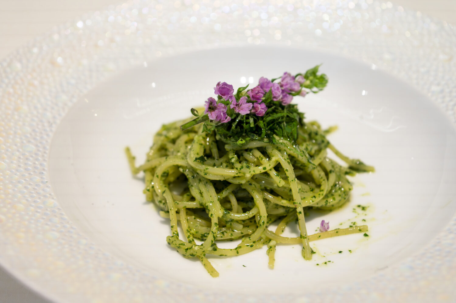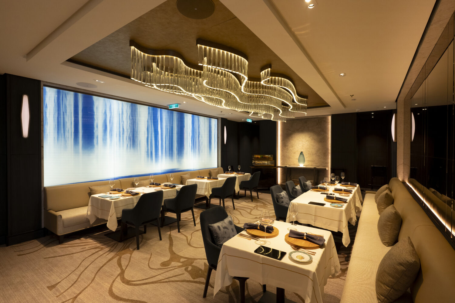 圧巻だったのは、イタリア料理「アルマーレ」。一人当たり11000円(税込み)の有料レストランだが、それも頷ける上級食材の数々が、まずはワゴンに載せて運ばれてくる。ここで食材と調理法を選ぶのだが……ホタテとアワビとロブスター、どれにしようかと悩む、贅沢なひとときが待っている。そしてそれら最上とも言うべき食材の数々は、麗しい料理に姿を変え、職人がひとつひとつ手書きしているジノリの華やかなお皿に載せられて供される。口に運ぶと思わずうなる、美食の数々は、まさにクルーズの“ハレ”を彩るゴージャスな瞬間だ。