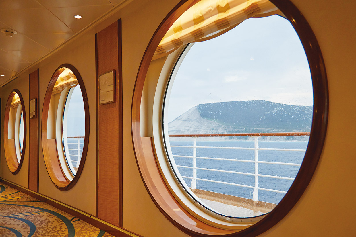 丸窓が美しいにっぽん丸。広い船尾デッキでは定番の「おはよう体操」も