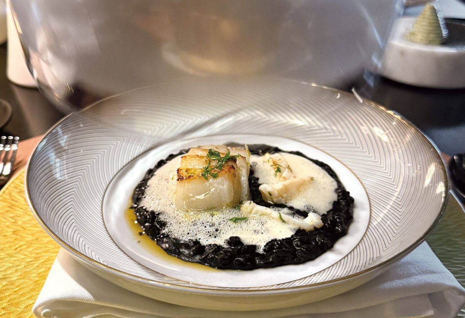 有料の「セタ・ス・ルミナーラ」はミシュラン星付きのイタリア著名シェフ、ファビオ・トランボキが手がける。よりフォーマルで特別感のあるダイニングで、8コースの料理が250ドル。ワインのペアリングだとプラス150ドル。