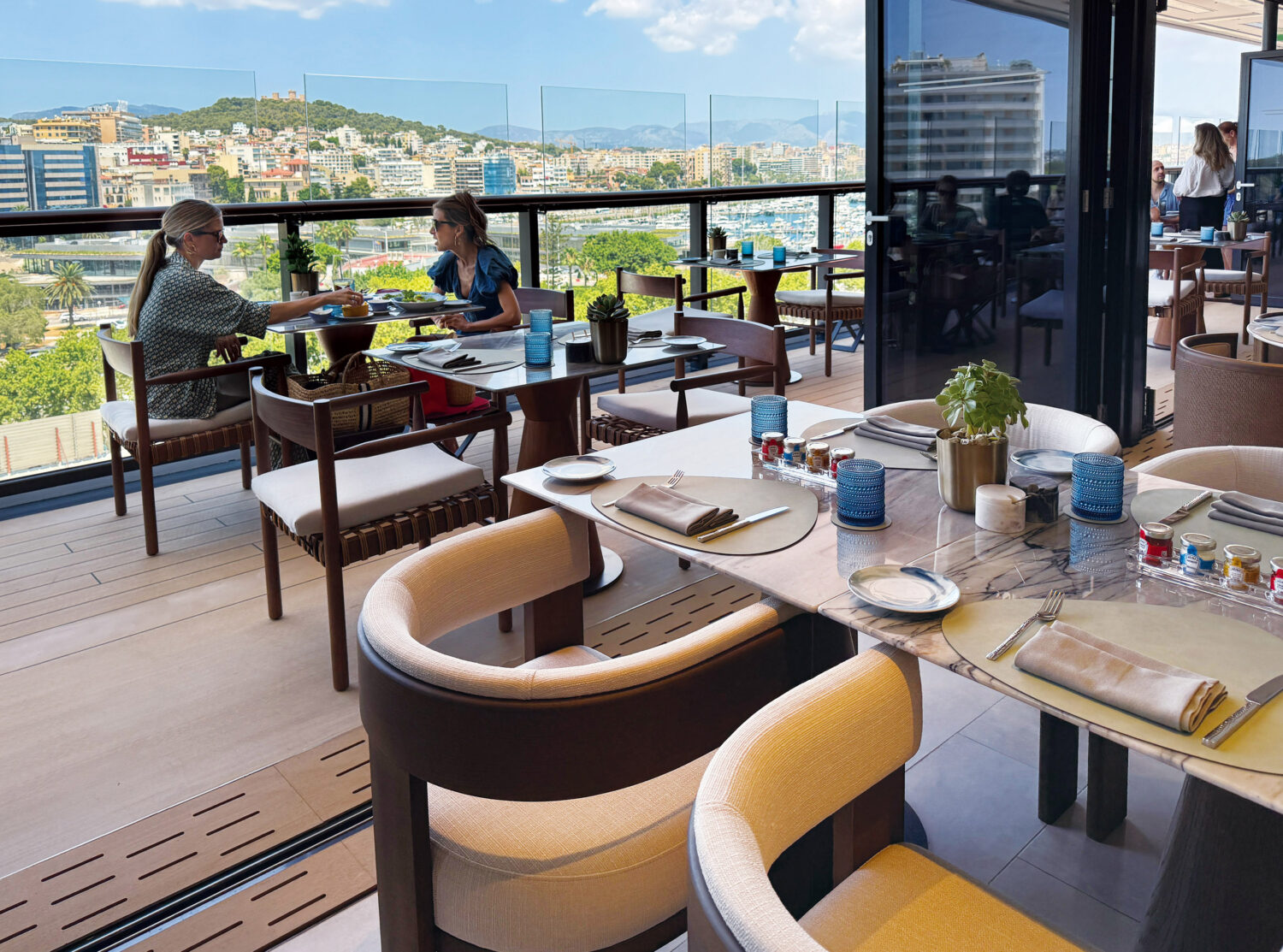 「ミストラル」は両側の窓を完全に開けると心地よいオープンデッキに。後ろの屋外席もあるので常に周囲の景色が楽しめる。朝昼夜と利用でき、ヘルシーメニューも多い。お昼は16時半まで開いているのでお茶タイムにも(予約不要・無料)