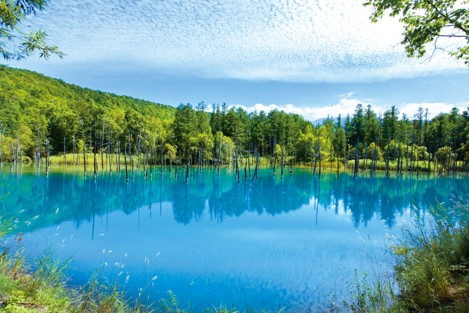 次に訪れたのは、青い池。鮮やかな青色の水面に立ち枯れた木々が映り込む光景は神秘的で、この日も多くの観光客でにぎわっていた。この池は十勝岳の噴火後、火山泥流を防ぐ工事の副産物として生まれたという。天候によって青の濃淡が変わるとされるが、晴天に恵まれたこの日はひときわ鮮やかな青。「私たち、幸運よね」とツアー参加者同士でほめ合う姿もほほえましかった。混雑を避けられる撮影スポットを教えてもらえるのもツアーの利点だ。