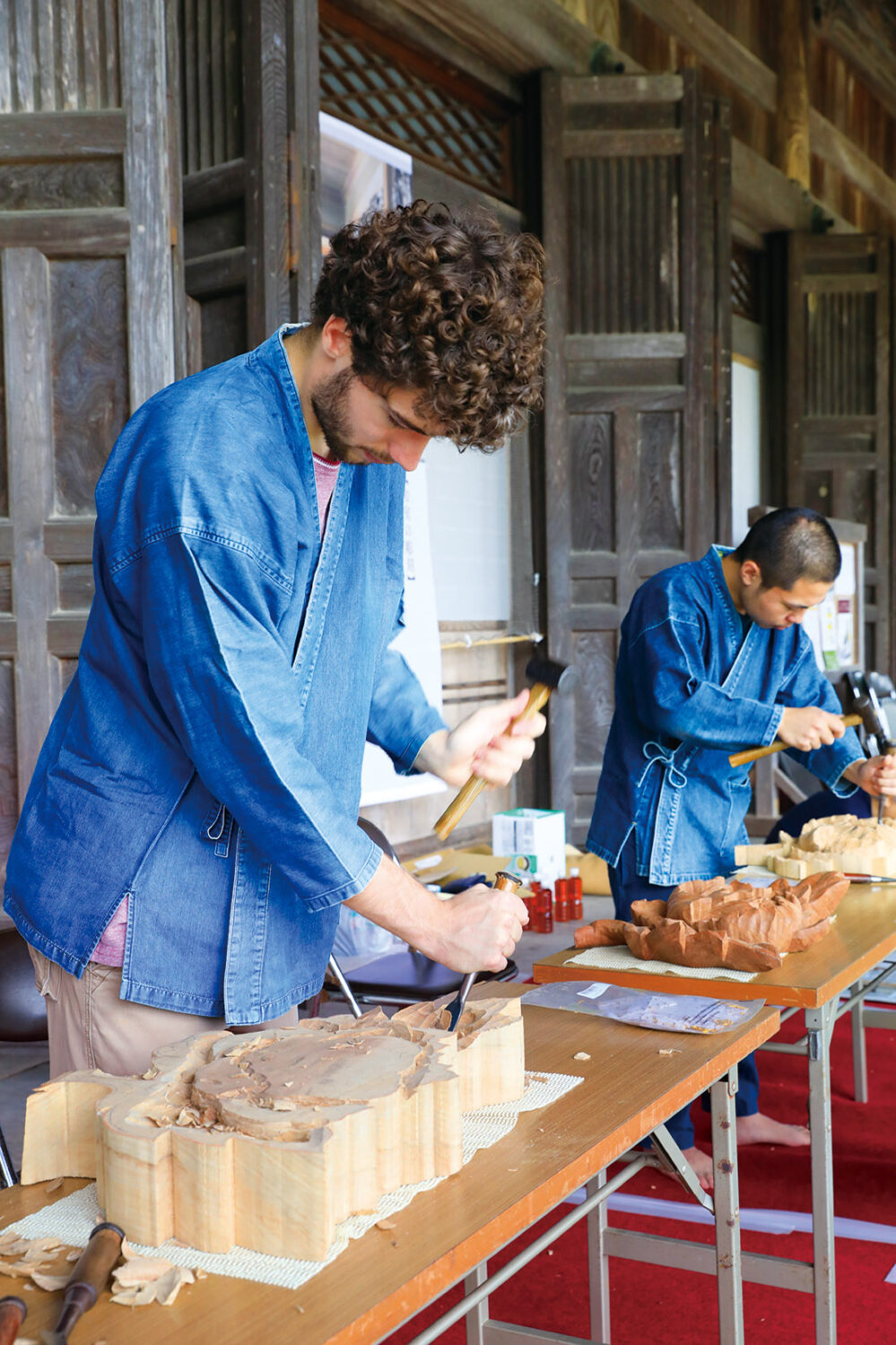 落ち着いたたたずまいの木造建築の商店が並ぶ井波の八日町通りを歩くと、その先に、この町を木彫の里として決定づけた仏教寺院「井波別院瑞泉寺」の江戸時代築の山門が現れた。ひと目見て、明らかに普通と違う壮麗な木彫装飾がわかる。立派な本殿と隣の太子殿にも、宮大工と木彫職人が技を極めた、美しく洗練された木彫りの装飾が施されていた。現在も井波には、木彫り職人が約100名いるという。残念ながらいろいろ見る時間が足りなかったが、再訪したい場所となった。