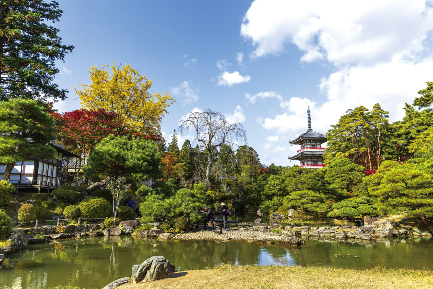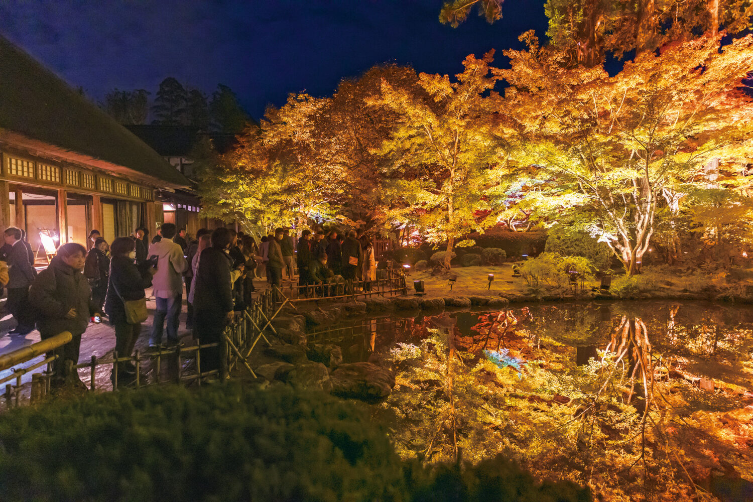 円通院では通称「鏡池」とも呼ばれる心字池に映る逆さ紅葉がハイライト。夜のテレビニュースでも生中継される全国的にも著名な見どころだけに、360度の錦繍に抱かれる幻想的な体験に心奪われる。隣の瑞巌寺はプロジェクションマッピングなどを駆使した動きのある表現がおもしろく、今の時代の夜間参拝とはこういうものかと感心、感嘆するだろう。